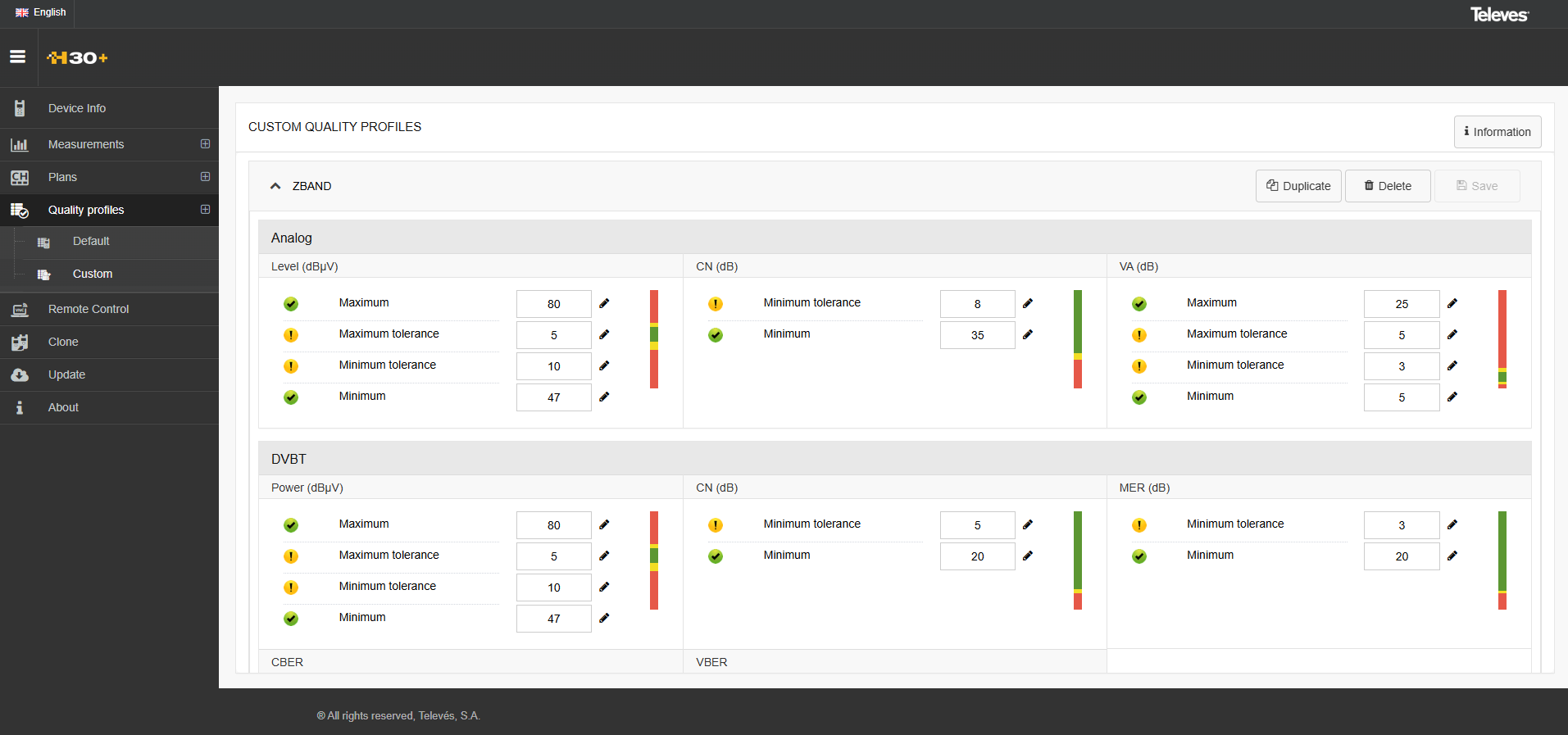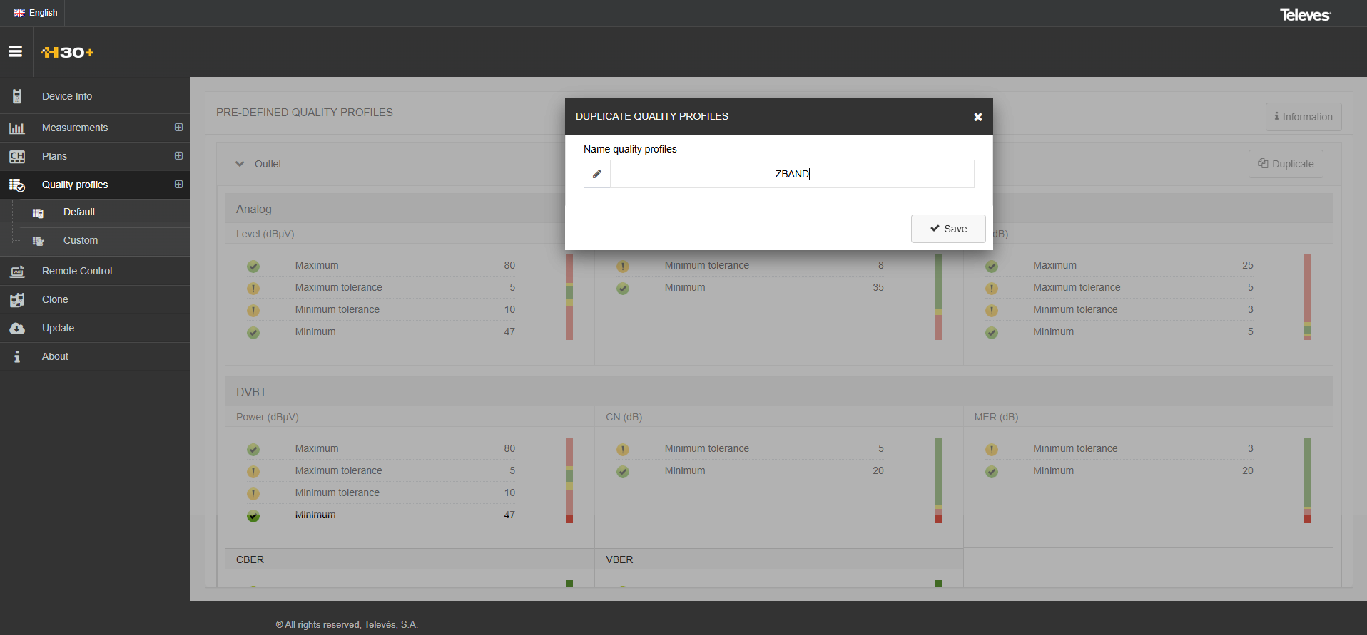 Quality profiles determines the color schemes the signal levels use when taking measurements on the meter. The color used are red, yellow and green. Using the web application of the H30 meter, you can view or add new quality profiles.