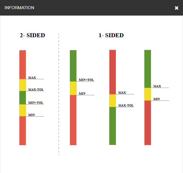 Each of the values can be adjusted by using the edit icon right next to the box. Some metrics have two sided limits for defining upper and lower bounds and some metrics only have a one sided limit. As the limit/tolerance numbers are adjusted, the web app adjusts the visual guide to show how the values for each of the colors is changed. This is shown in the example below. The second image below shows the values being adjusted from the defaults.
