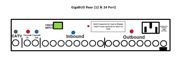 - Slave/Cascade mode unit: While the unit is in cascade mode with no feed into "Cascade In" port and the button is held for ~5 seconds, the unit will switch to a native state and all four LED lights will be on on the front panel of the unit. When a feed is present then the red button function is disabled.