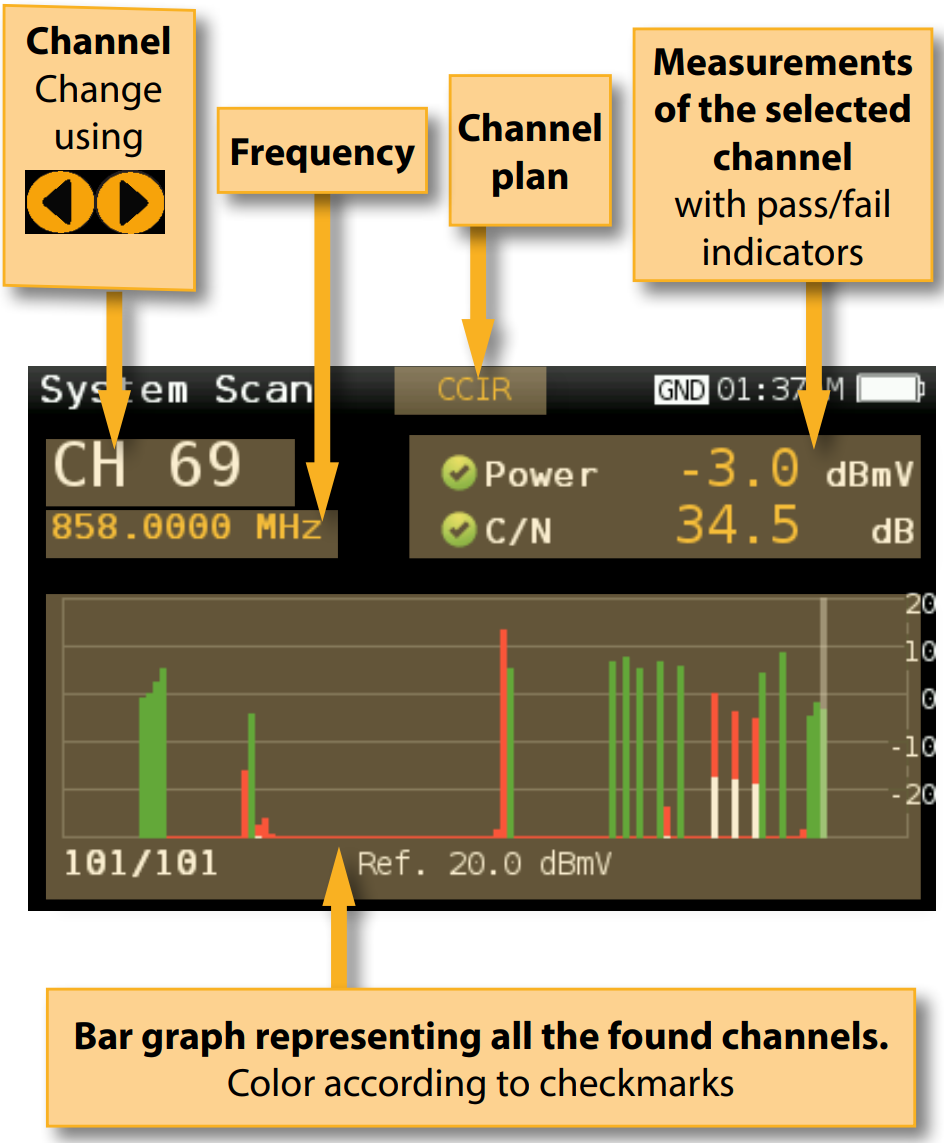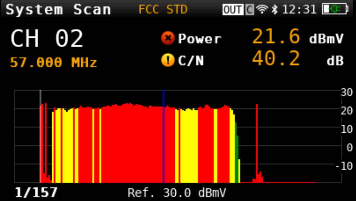 This article provides instructions on how to perform an RF system scan using the Televes H30+ Meter in a CATV environment. This feature is useful for verifying active channel presence and overall system health. 'System Scan' option allows the Televes H30+ Meter to highlight all active RF channels within a selected frequency plan. It also provides key performance metrics such as channel power levels, Carrier-to-Noise Ratio (C/N), Modulation Error Ratio (MER), and signal quality indicators—enabling quick identification of system performance issues, missing or degraded channels.