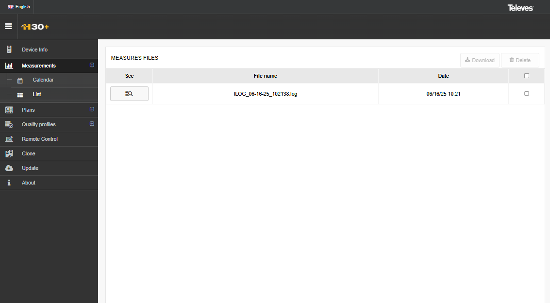 The saved data log will be stored locally on the unit, this data log can later be retrieved by connecting the meter to a network either via Wi-Fi or wired ethernet connection. On the computer where you want to access these data logs, open a web browser and type in the IP address of the meter. This should load the web-app for the Televes meter.