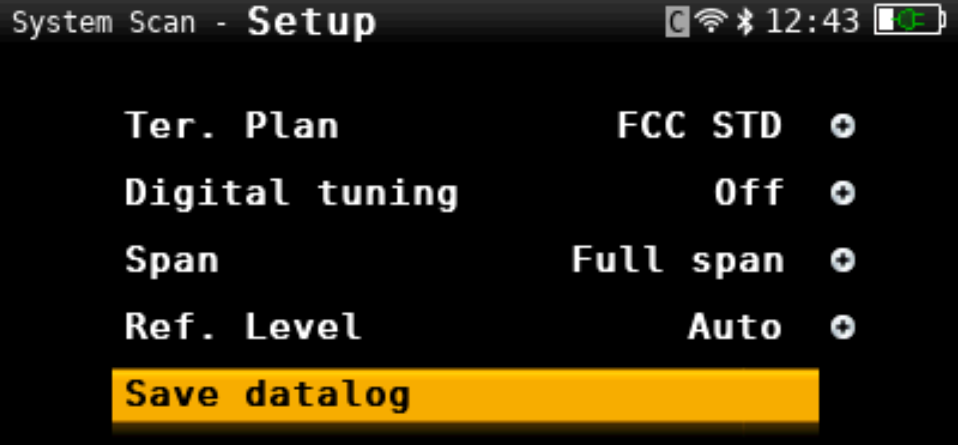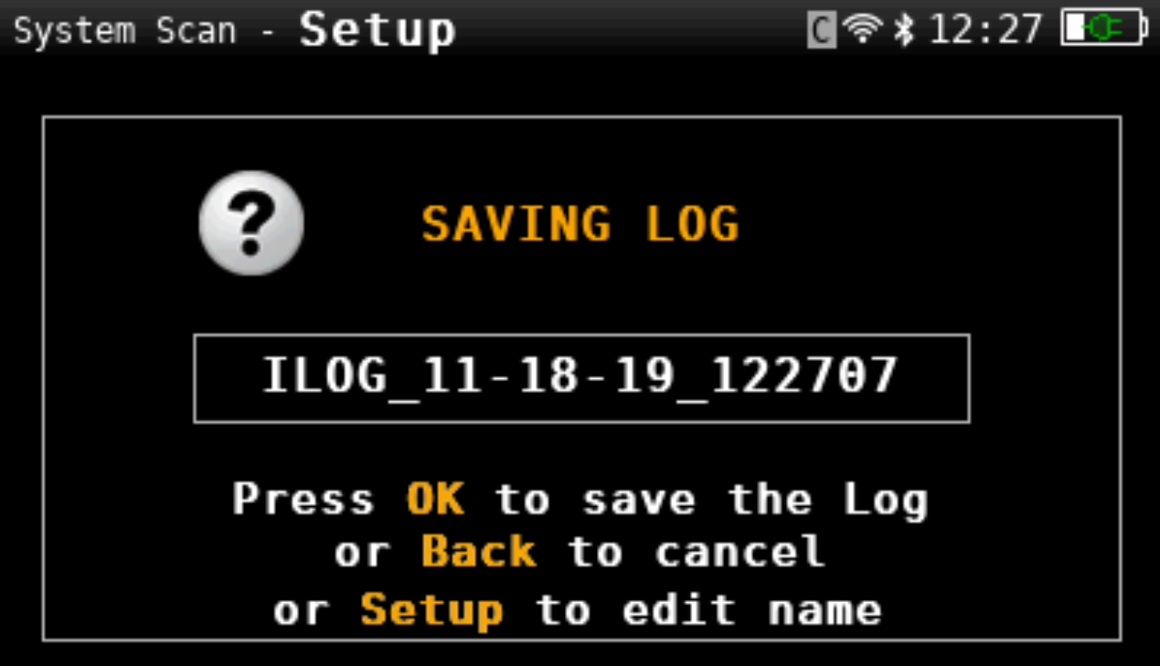 While in System scan mode, press the Settings (Gear) icon and select Save datalog option. Press OK to save the log with the default name, or select the settings/gear button again to rename the file to something more descriptive and relevant to your specific system or test location. The default name of the data log is date and time of the data capture and if the date/time are set incorrectly on the unit then the files names shown are also incorrect.